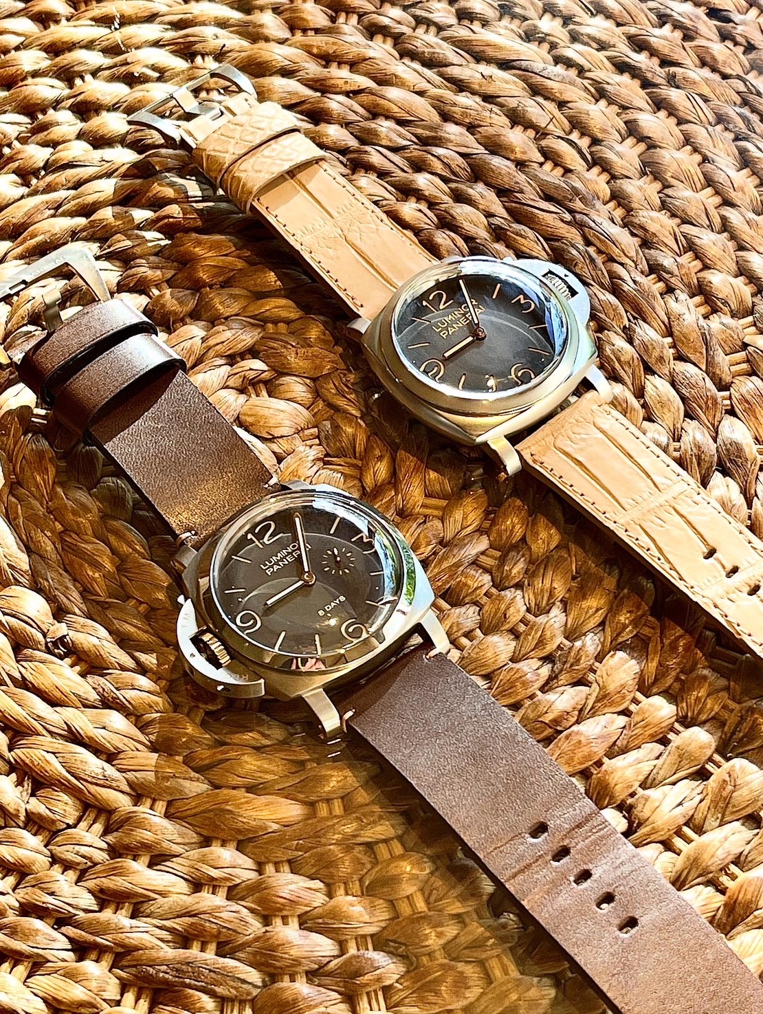 「栃木レザーヌメ × こげ茶 × ベージュかがり × 防水裏こげ茶」という組み合わせは、パネライ PAM00368の存在感を一層際立たせる仕様。無駄を削ぎ落としたデザインが素材の魅力を引き出し、腕元に重厚で温かな表情を添えます。